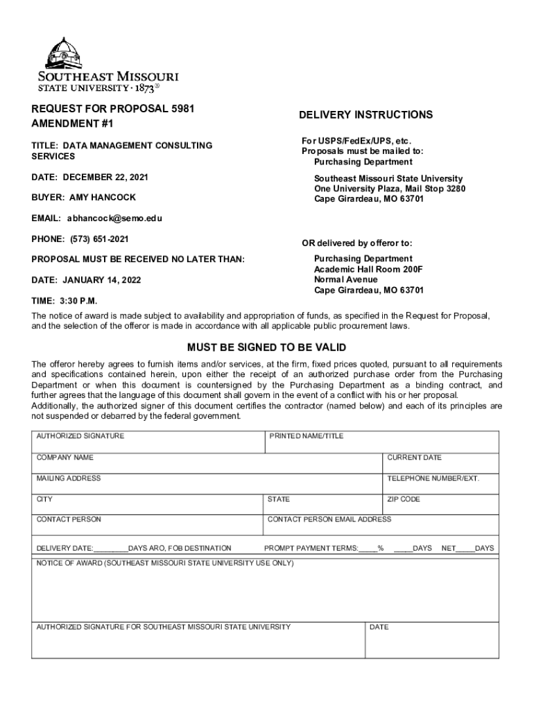 REQUEST FOR PROPOSAL 5981 AMENDMENT #1DELIVERY INSTRUCTIONS For USPS/FedEx/UPS, etc. Proposals must be mailed to: Purchasing DepartmentTITLE: DATA MANAGEMENT CONSULTING SERVICES DATE: DECEMBER 22,
