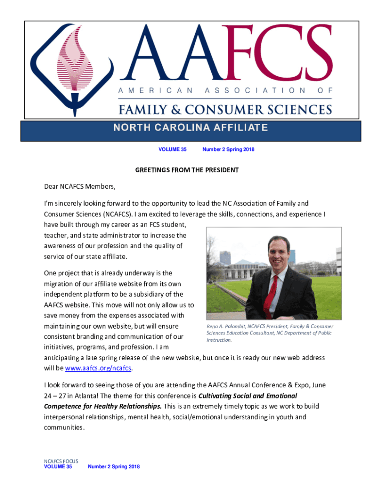 NORTH CAROLINA AFFILIATE VOLUME 35Number 2 Spring 2018GREETINGS FROM THE PRESIDENT Dear NCA FCS Members, I'm sincerely looking forward to the opportunity to lead the NC Association of Family and Consumer