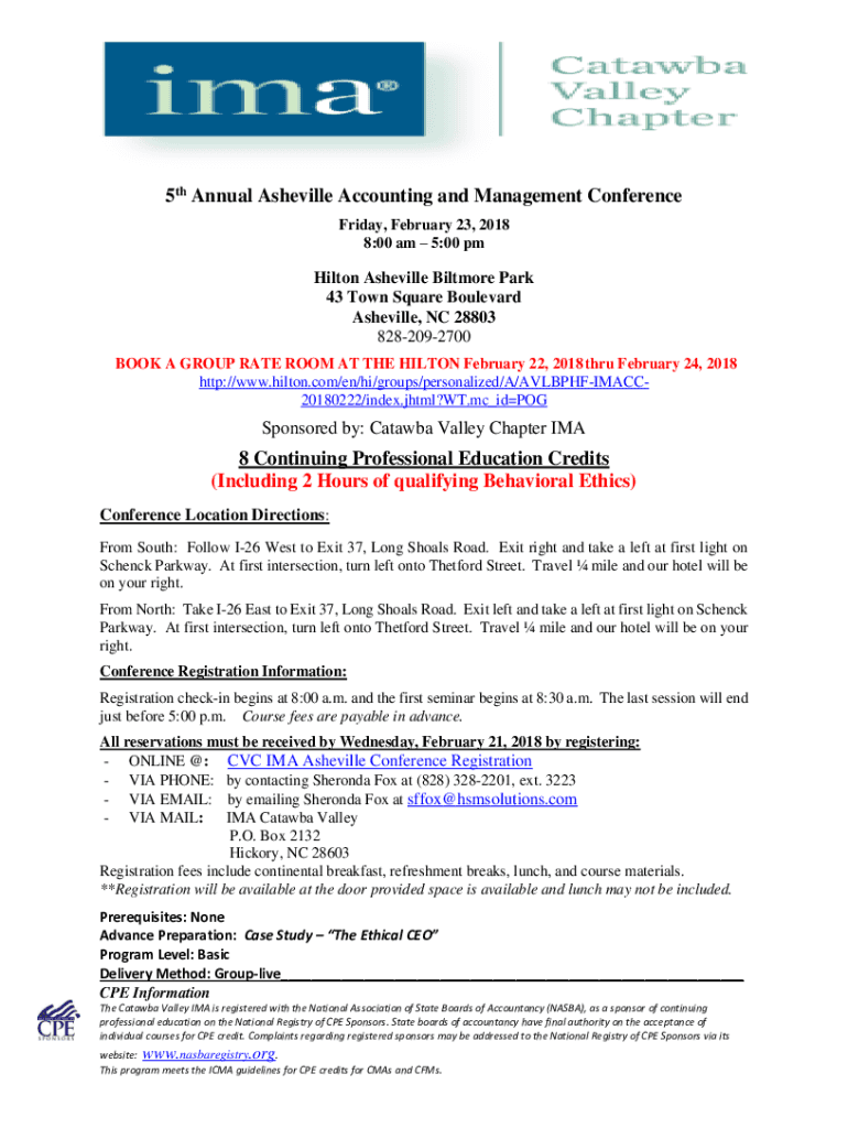 5th Annual Asheville Accounting and Management Conference Friday, February 23, 2018 8:00 am 5:00 pm Hilton Asheville Biltmore Park 43 Town Square Boulevard Asheville, NC 28803 8282092700 BOOK A GROUP