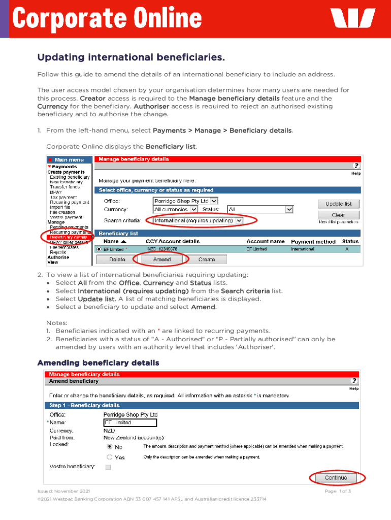 Updating international beneficiaries. Follow this guide to amend the details of an international beneficiary to include an address. The user access model chosen by your organization determines how