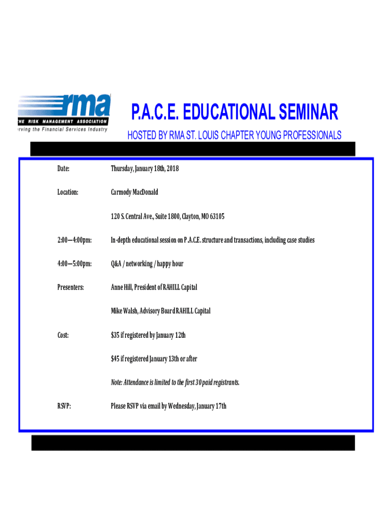 P.A.C.E. EDUCATIONAL SEMINAR HOSTED BY RMA ST. LOUIS CHAPTER YOUNG PROFESSIONALS Date:Thursday, January 18th, 2018Location:Harmony MacDonald 120 S. Central Ave., Suite 1800, Clayton, MO 631052:004:00pm:In