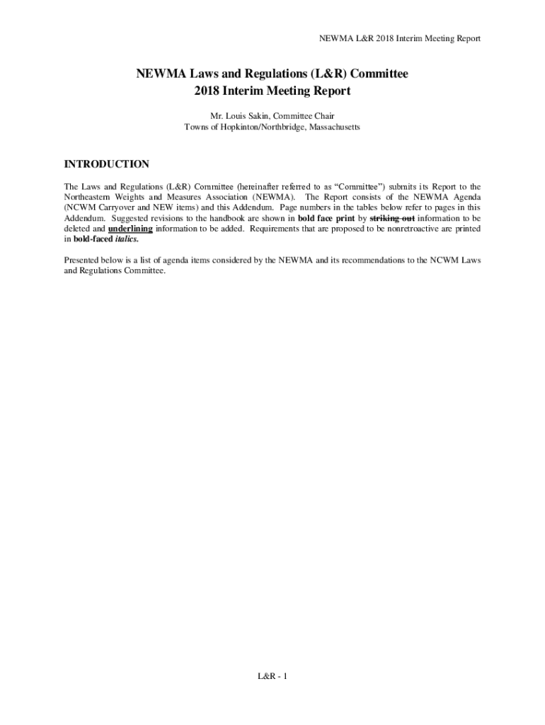 NEWMAN L&R 2018 Interim Meeting ReportNEWMA Laws and Regulations (L&R) Committee