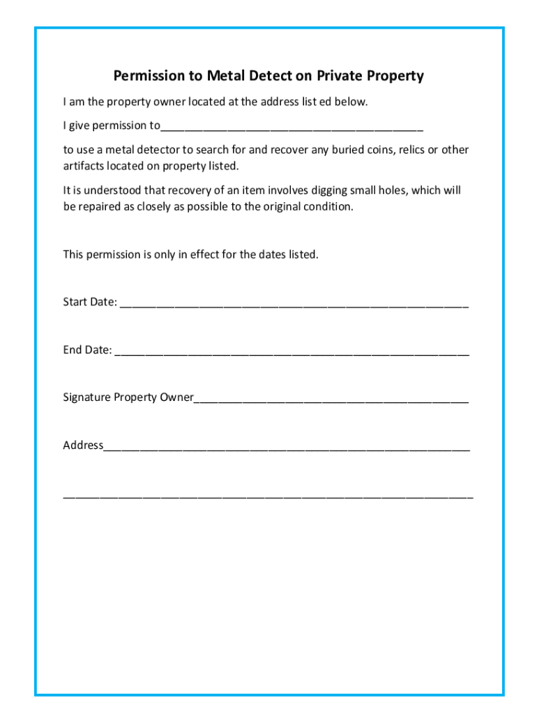 The formmetaldetectingguycommetal-detectingmetal detecting permission letter typically requires basic information such as name, contact information, property address, and details of the metal detecting activity.