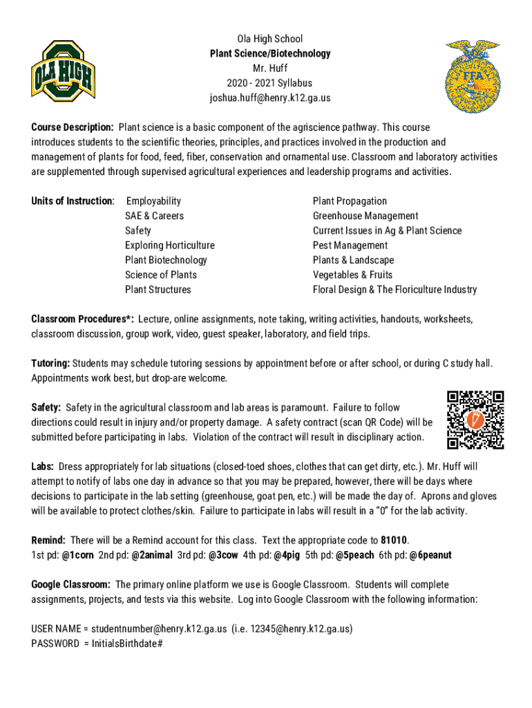 Ola High School Plant Science/Biotechnology Mr. Huff 2020 2021 Syllabus joshua.huff@henry.k12.ga.us Course Description: Pl ant science is a basic component of the agriscience pathway. This course