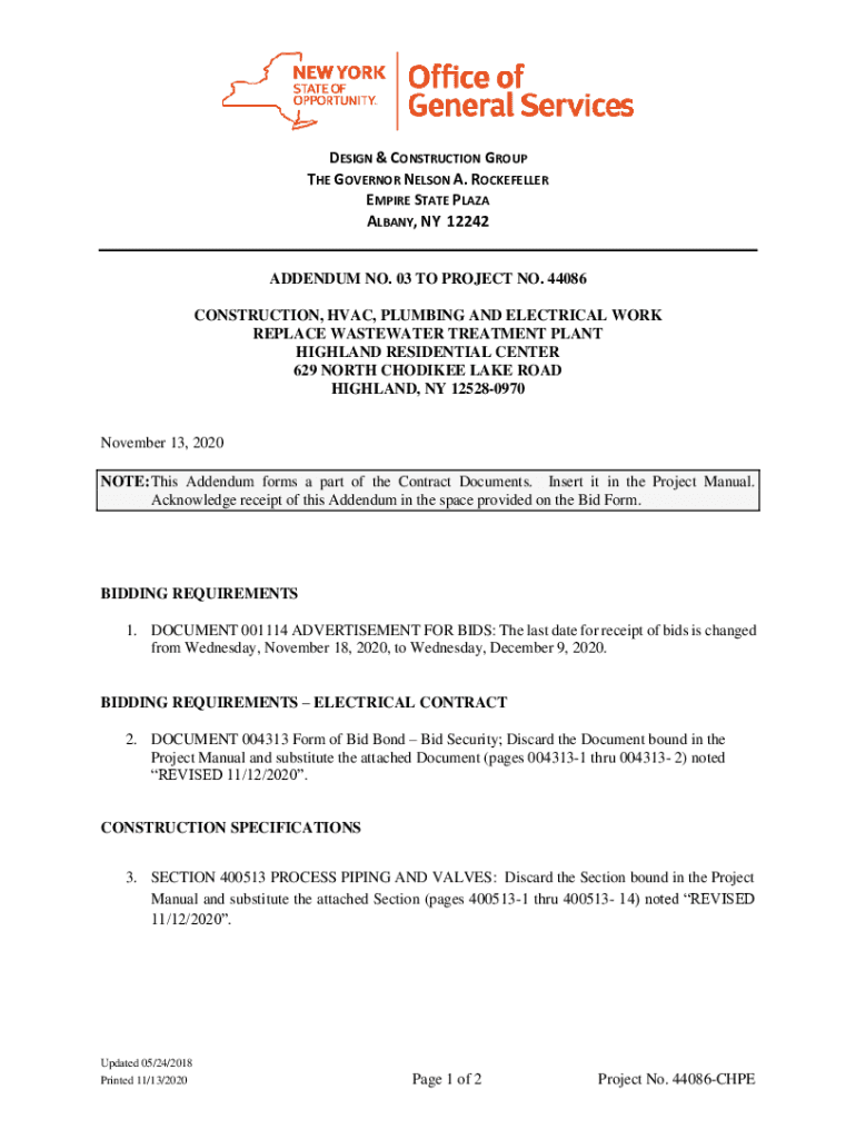 DESIGN & CONSTRUCTION GROUP THE GOVERNOR NELSON A. ROCKEFELLER EMPIRE STATE PLAZA ALBANY, NY 12242 ADDENDUM NO. 03 TO PROJECT NO. 44086 CONSTRUCTION, HVAC, PLUMBING AND ELECTRICAL WORK REPLACE WASTEWATER