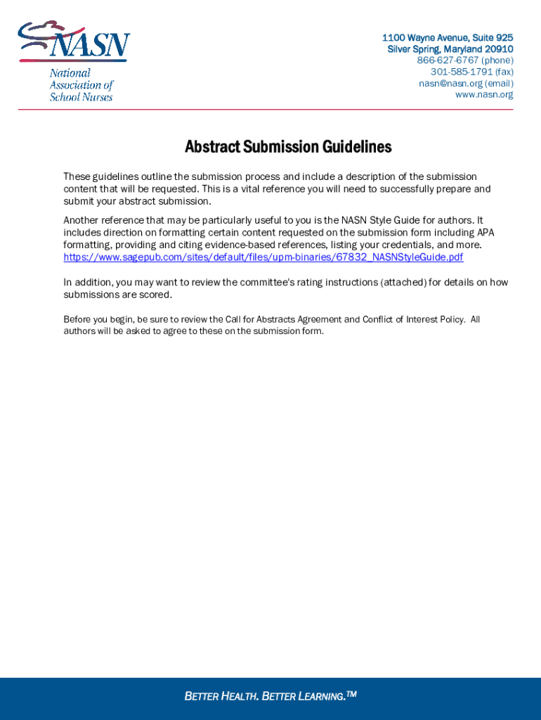 1100 Wayne Avenue, Suite 925 Silver Spring, Maryland 20910 8666276767 (phone) 3015851791 (fax) nasn@nasn.org (email) www.nasn.orgAbstract Submission Guidelines These guidelines outline the submission