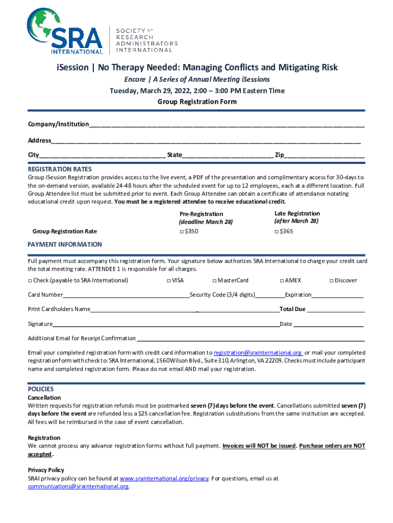 Session|NoTherapyNeeded:ManagingConflictsandMitigatingRisk Encore|ASeriesofAnnualMeetingiSessions Tuesday,March29,2022,2:003:00PMEasternTime GroupRegistrationForm Company/Institution___ Address___