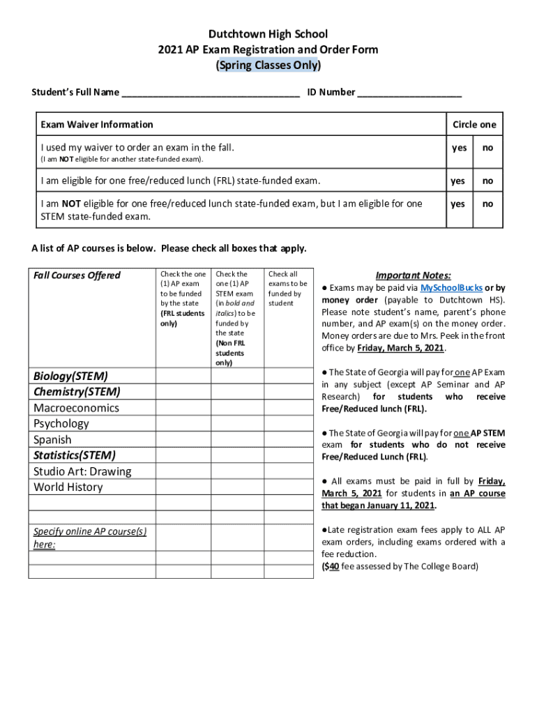 Dutch town High School 2021 AP Exam Registration and Order Form (Spring Classes Only) Students Full Name ___ ID Number ___ Exam Waiver InformationCircle one used my waiver to order an exam in the
