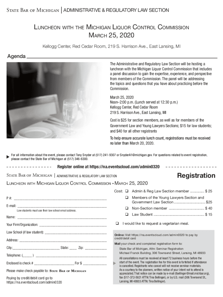 State Bar of Michigan | ADMINISTRATIVE & REGULATORY LAW SECTIONLuncheon with the Michigan Liquor Control Commission March 25, 2020, Kellogg Center, Red Cedar Room, 219 S. Harrison Ave., East Lansing,