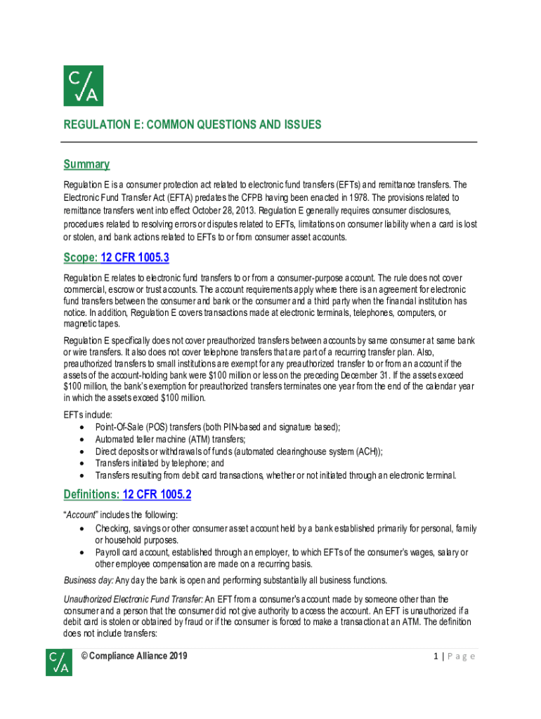 REGULATION E: COMMON QUESTIONS AND ISSUES Summary Regulation E is a consumer protection act related to electronic fund transfers (Eats) and remittance transfers. The Electronic Fund Transfer Act (ETA)