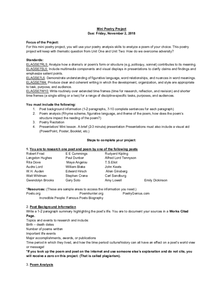 Mini Poetry Project Due: Friday, November 2, 2018, Focus of the Project: For this mini poetry project, you will use your poetry analysis skills to analyze a poem of your choice. This poetry project