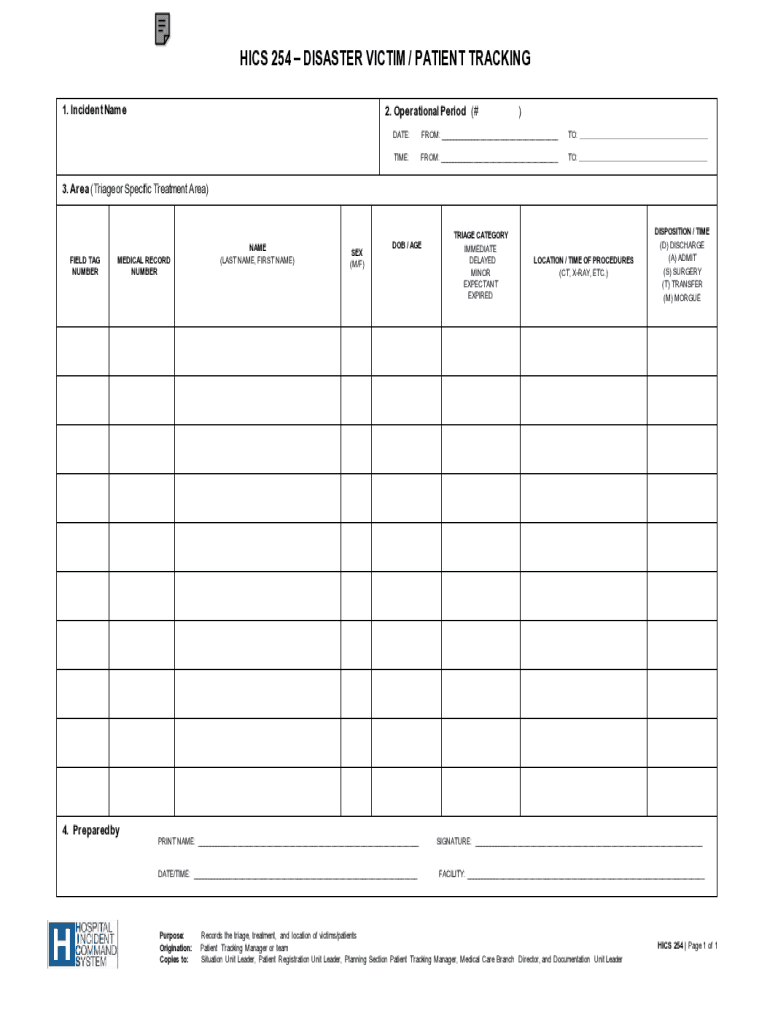 HIS 254 DISASTER VICTIM / PATIENT TRACKING 1. Incident Nam e2. Operational Period (#)DATE:FROM: ___TO: ___TIME:FROM: ___TO: ___3. Area (Triage or Specific Treatment Area)FIELD TAG NUMBERMEDICAL RECORD