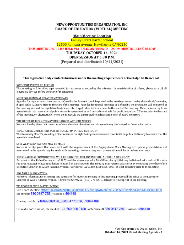NEW OPPORTUNITIES ORGANIZATION, INC. BOARD OF EDUCATION (VIRTUAL) MEETING Main Meeting Location Family First Charter School 12500 Ramona Avenue, Hawthorne CA 90250 THIS MEETING WILL BE HELD VIA TELECONFERENCE