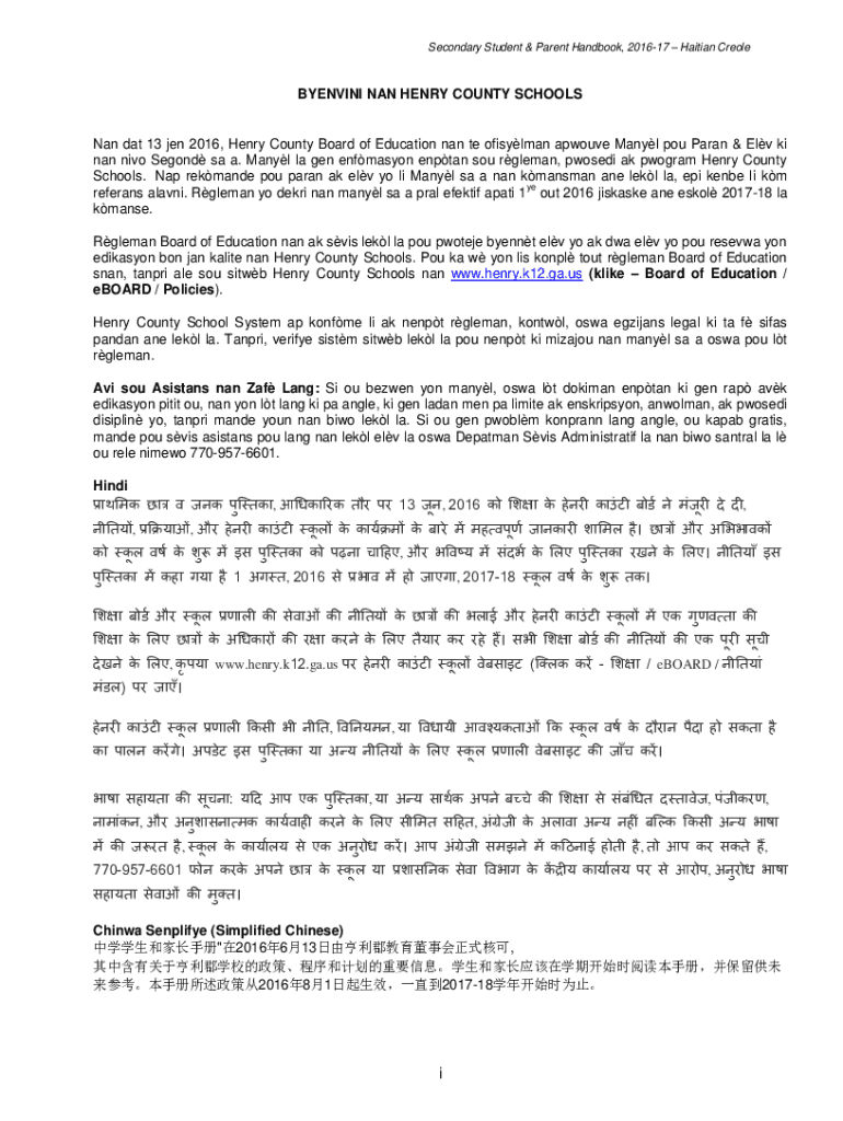 Secondary Student & Parent Handbook, 201617 Haitian CreoleBYENVINI NAN HENRY COUNTY SCHOOLS Nan DAT 13 Jen 2016, Henry County Board of Education Nan the oilman above Many POU Pagan & Elf I Nan NIO