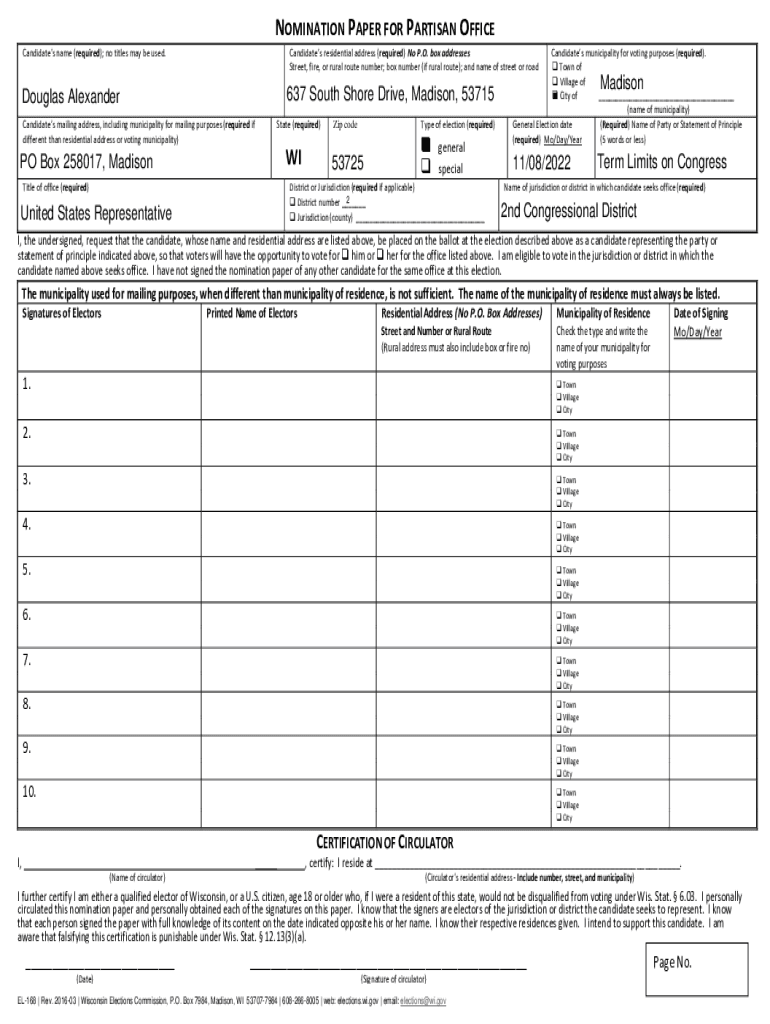 NOMINATION PAPER FOR PARTISAN OFFICE Candidates residential address (required) No P.O. box addresses Street, fire, or rural route number; box number (if rural route); and name of street or non-candidate\'s