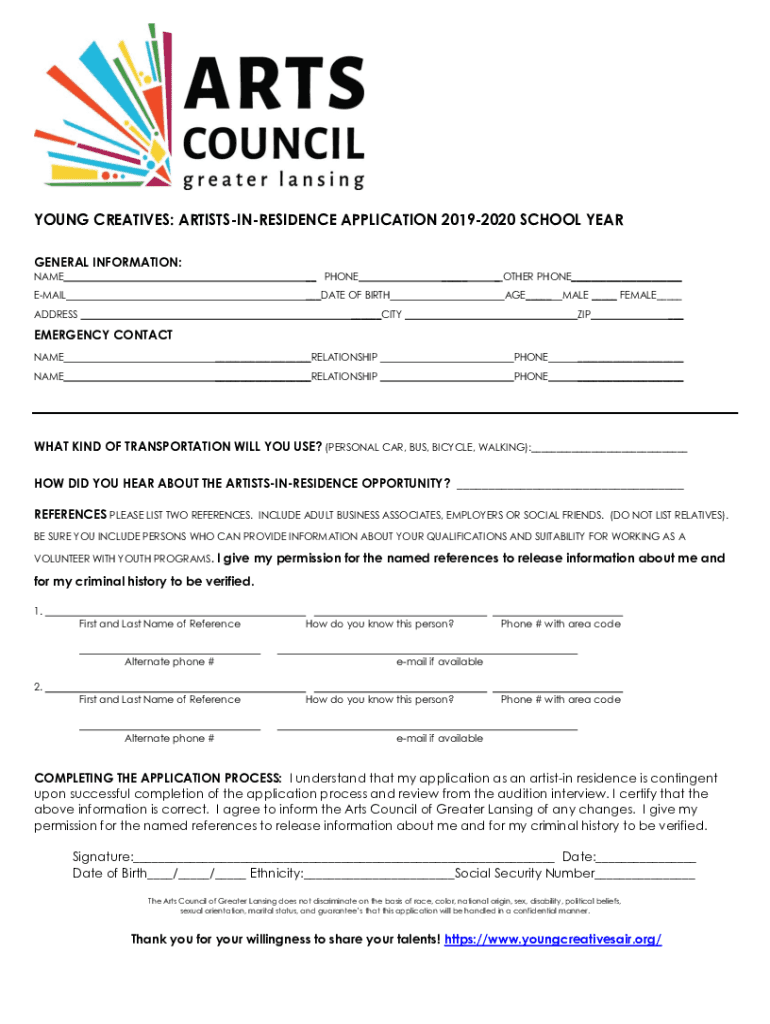 YOUNG CREATIVES: ARTISTSINRESIDENCE APPLICATION 20192020 SCHOOL YEAR GENERAL INFORMATION: NAME__ PHONEEMAIL___DATE OF BIRTHADDRESS____ OTHER PHONE___ AGE______CITYMALE ___ FEMALE___ ZIP___EMERGENCY