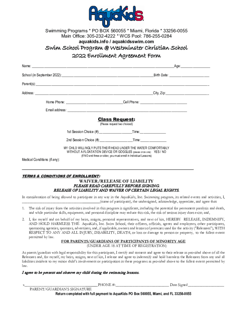 Swimming Programs * PO BOX 560055 * Miami, Florida * 332560055 Main Office: 3052324222 * WCS Pool: 7862550284 aqua kids.info / aquakidsswim.COSSIM School Program @ Westminster Christian School 2022
