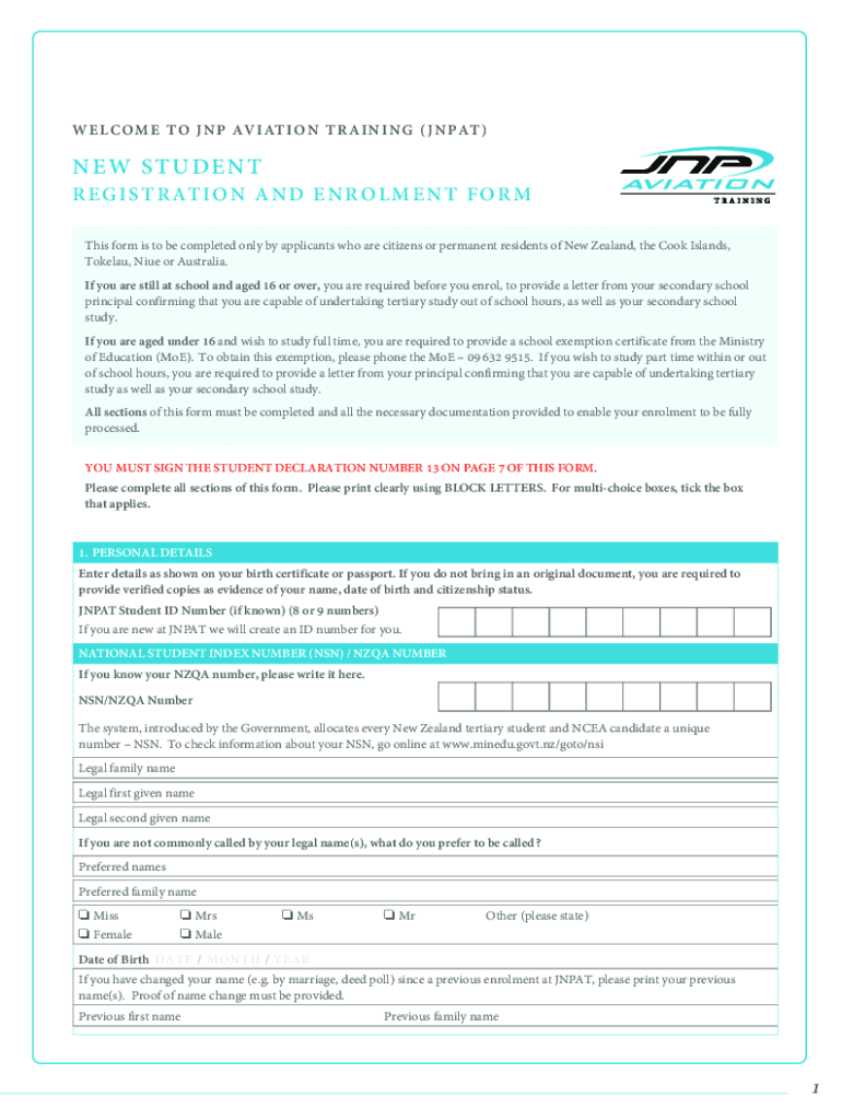 WE L CO M E TO IN P AVIATION N TRAINING (J PAT)NEW STU DE NTR EG INSTR AT ION A ND EURO LM E N T F O R MTRAININGThis form is to be completed only by applicants who are citizens or permanent residents