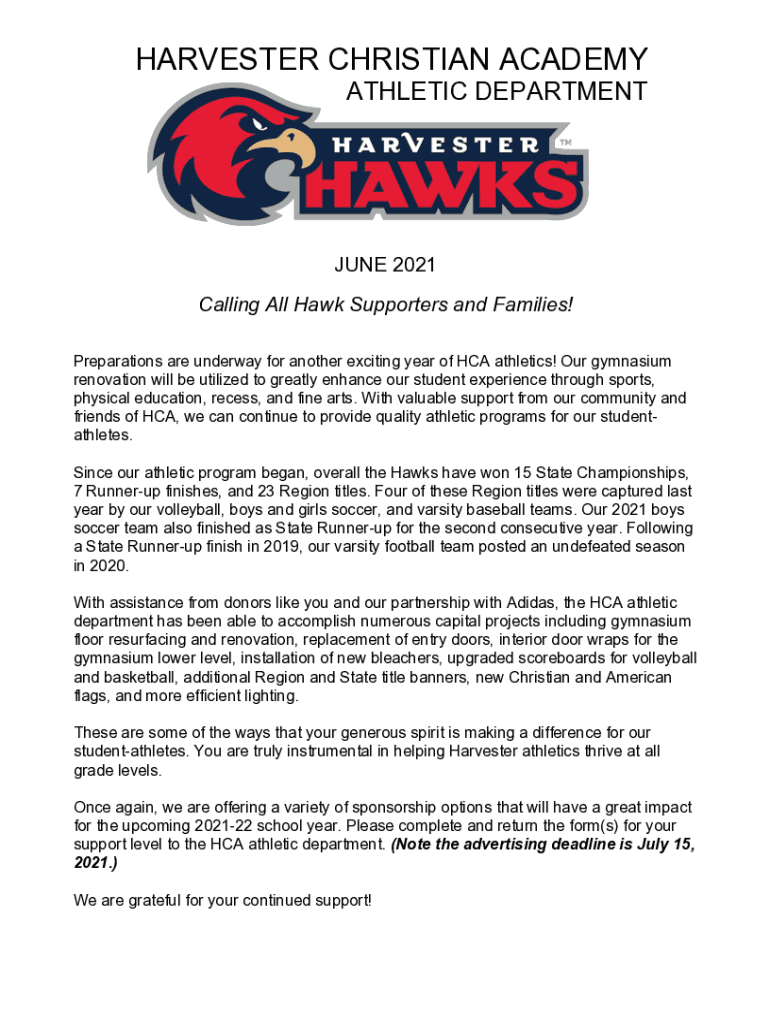 HARVESTER CHRISTIAN ACADEMY ATHLETIC DEPARTMENTJUNE 2021 Calling All Hawk Supporters and Families! Preparations are underway for another exciting year of HCA athletics! Our gymnasium renovation will