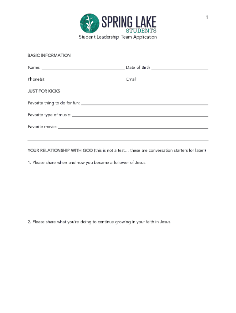 1Student Leadership Team Application BASIC Informational:Date of Birthstone(s):Email:JUST FOR KICKSFavorite thing to do for fun: Favorite type of music: Favorite movie:YOUR RELATIONSHIP WITH GOD (this