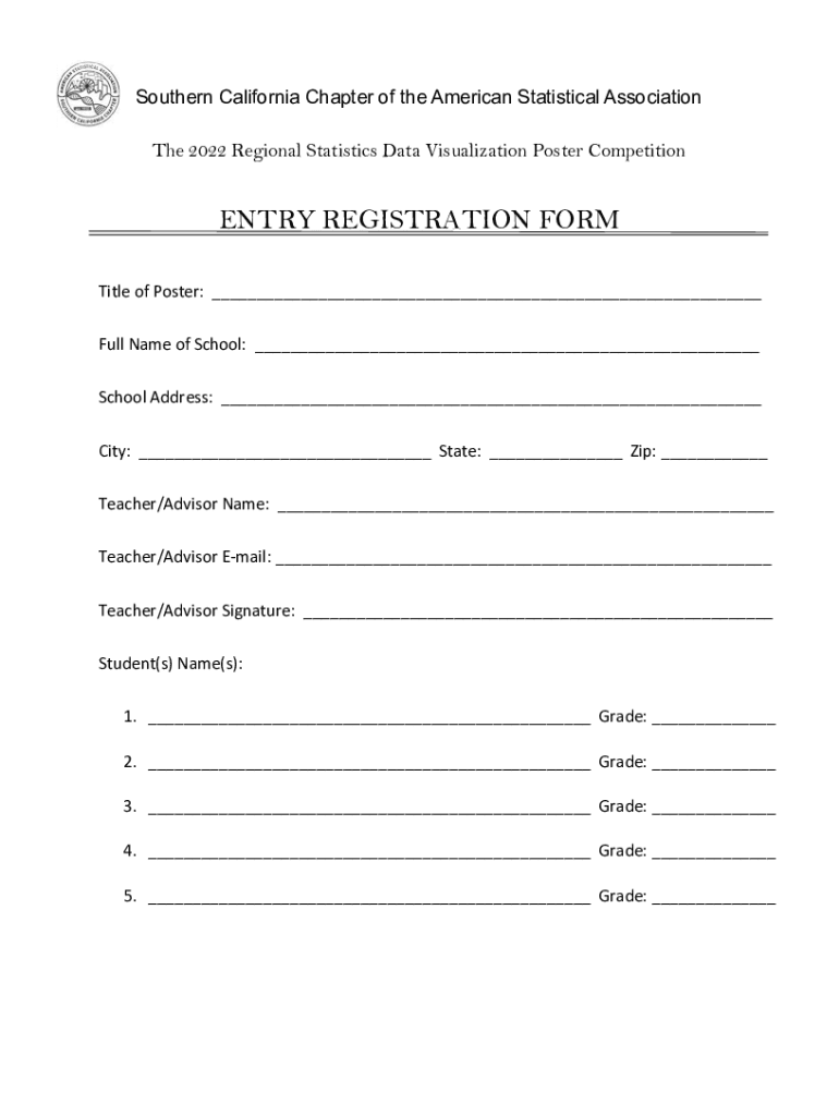 Southern California Chapter of the American Statistical Association The 2022 Regional Statistics Data Visualization Poster CompetitionENTRY REGISTRATION FORM Title of Poster: ___ Full Name of School: