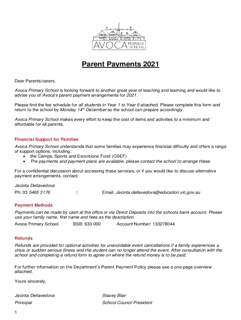 Parent Payments 2021 Dear Parents/carers, Avoid Primary School is looking forward to another great year of teaching and learning and would like to advise you of Vocals parent payment arrangements