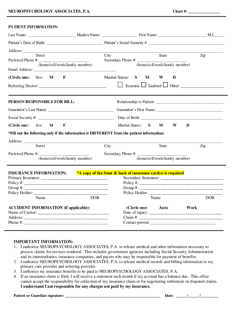 NEUROPSYCHOLOGY ASSOCIATES, P.A. Chart #: ___PATIENT INFORMATION: Last Name: ___ Maiden Name: ___ First Name: ___ M.I.___ Patients Date of Birth: ___ Patients Social Security #: ___ Address: ___ Street