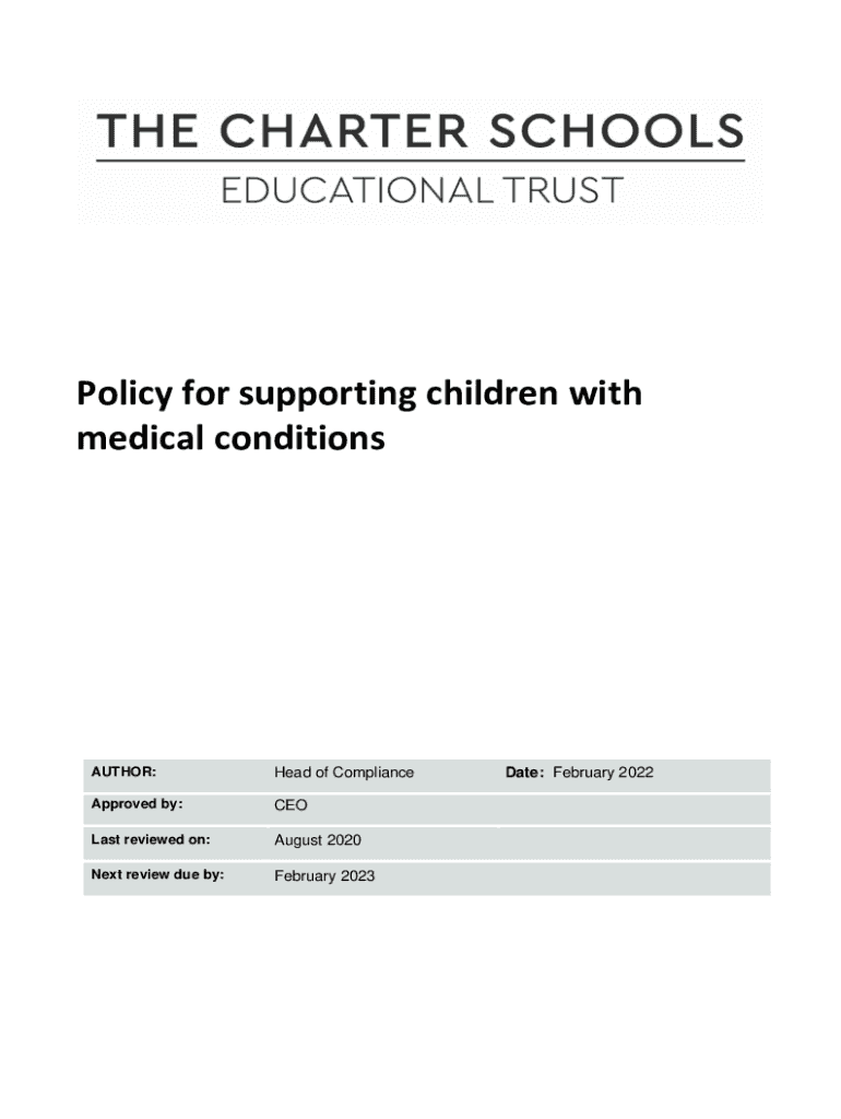 Policy for supporting children with medical conditionsAUTHOR:Head of ComplianceApproved by:Coast reviewed on:August 2020Next review due by:February 2023Date: February 2022The Charter Schools Educational