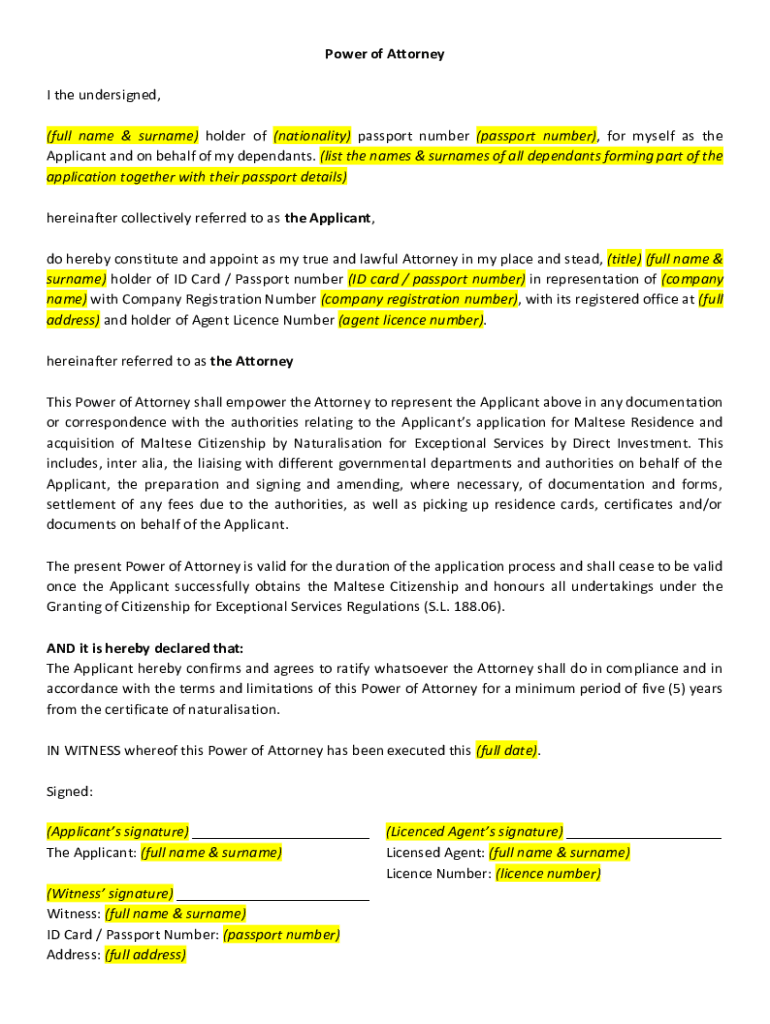 Power of Attorney I the undersigned, (full name & surname) holder of (nationality) passport number (passport number), for myself as the Applicant and on behalf of my defendants. (list the names &