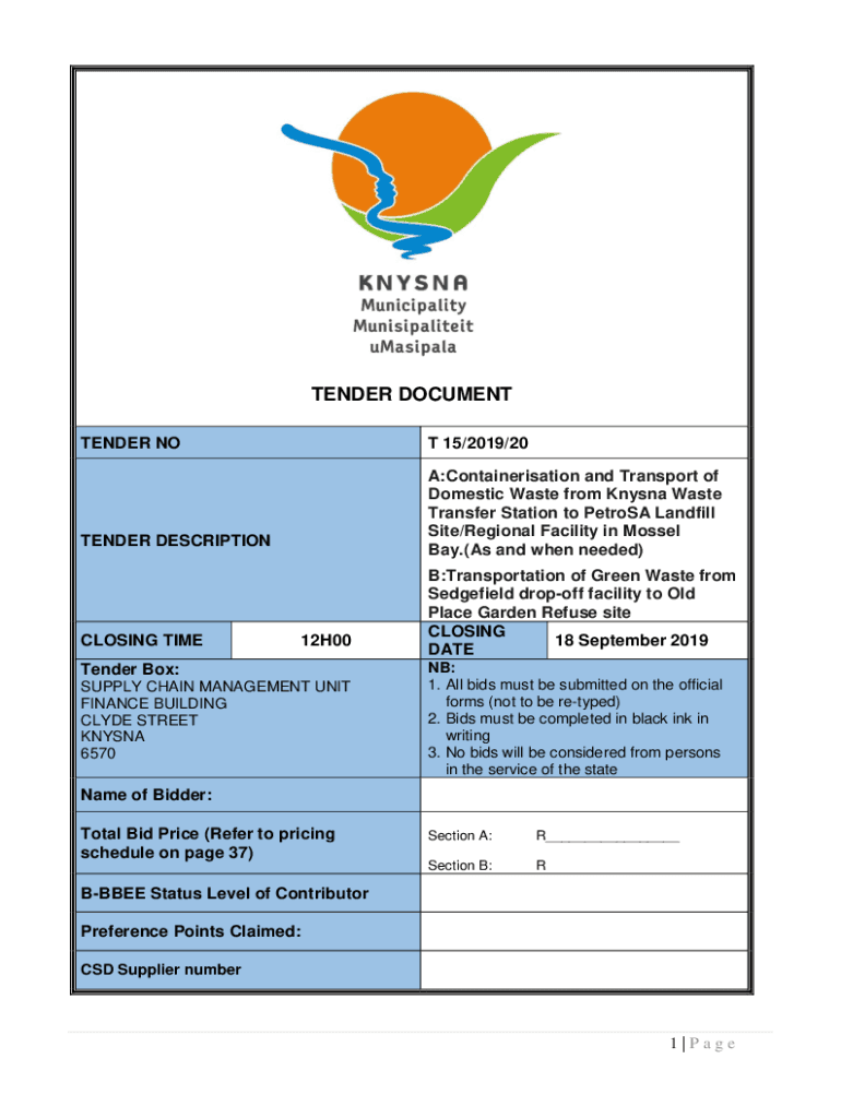 TENDER DOCUMENT TENDER NOT 15/2019/20 A:Containerization and Transport of Domestic Waste from Kṛṣṇa Waste Transfer Station to Petra Landfill Site/Regional Facility in Mosses Bay.(As and when