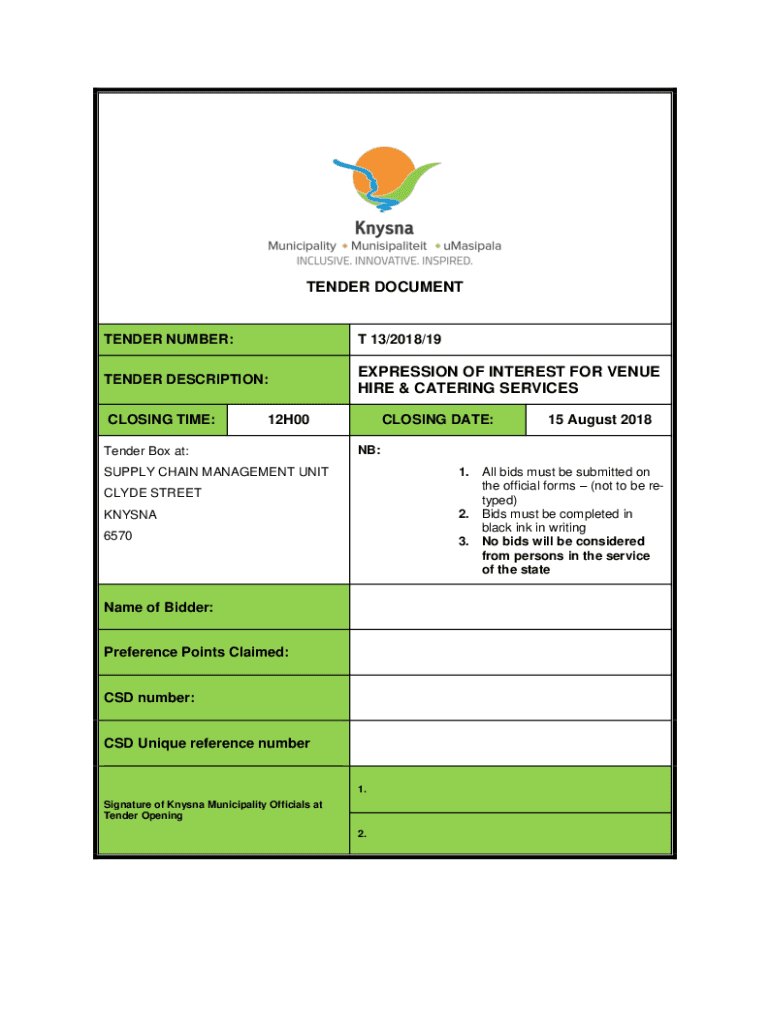TENDER DOCUMENTTENDER NUMBER’T 13/2018/19TENDER DESCRIPTION:EXPRESSION OF INTEREST FOR VENUE HIRE & CATERING SERVICESCLOSING TIME:12H00Tender Box at:CLOSING DATE:15 August 2018NB:SUPPLY CHAIN MANAGEMENT