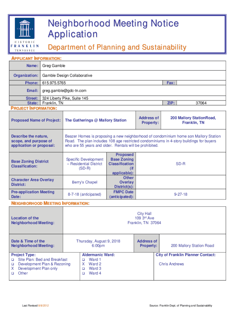 Neighborhood Meeting Notice Application Department of Planning and Sustainability APPLICANT INFORMATION: Name: Organization: Phone: Email:Greg Gamble Design Collaborative 615.975.5765Fax:Greg.gamble@gdctn.comStreet: