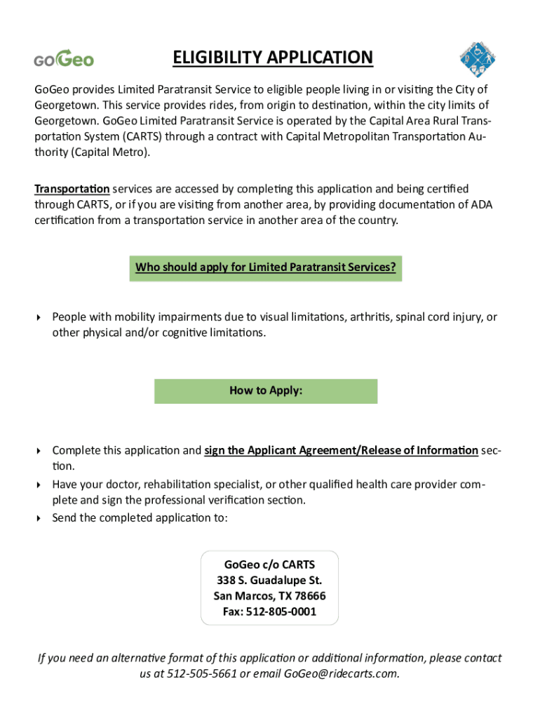 ELIGIBILITY APPLICATION Go Geo provides Limited Para transit Service to eligible people living in or visiting the City of Georgetown. This service provides rides, from origin to destination, within