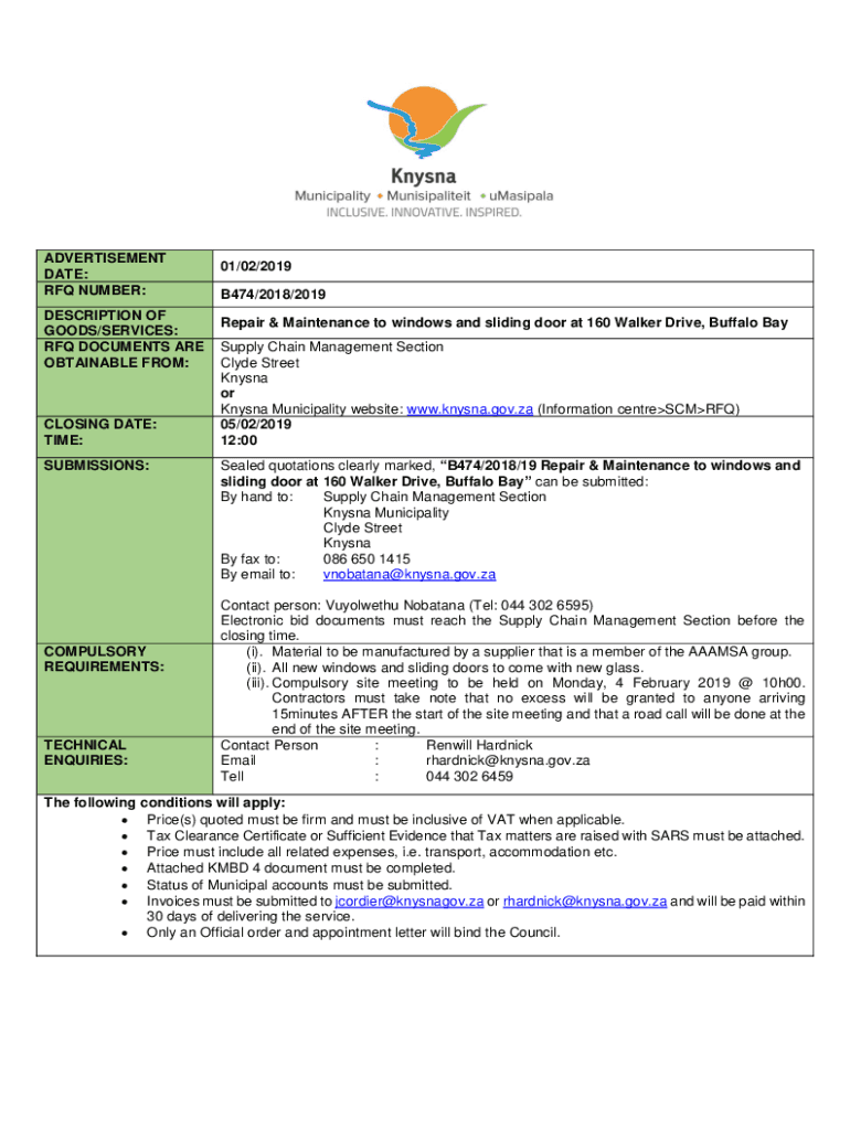 ADVERTISEMENT DATE: RFQ NUMBER: DESCRIPTION OF GOODS/SERVICES: RFQ DOCUMENTS ARE OBTAINABLE FROM:CLOSING DATE: TIME: SUBMISSIONS:COMPULSORY REQUIREMENTS:TECHNICAL Inquiries:01/02/2019 B474/2018/2019