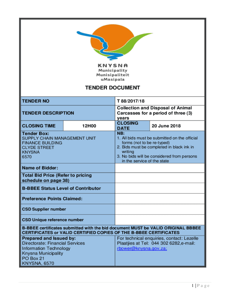 TENDER DOCUMENT TENDER NOT 88/2017/18TENDER DESCRIPTION CLOSING TIME12H00Tender Box: SUPPLY CHAIN MANAGEMENT UNIT FINANCE BUILDING CLYDE STREET KṚṢṆA 6570Collection and Disposal of Animal Carcasses