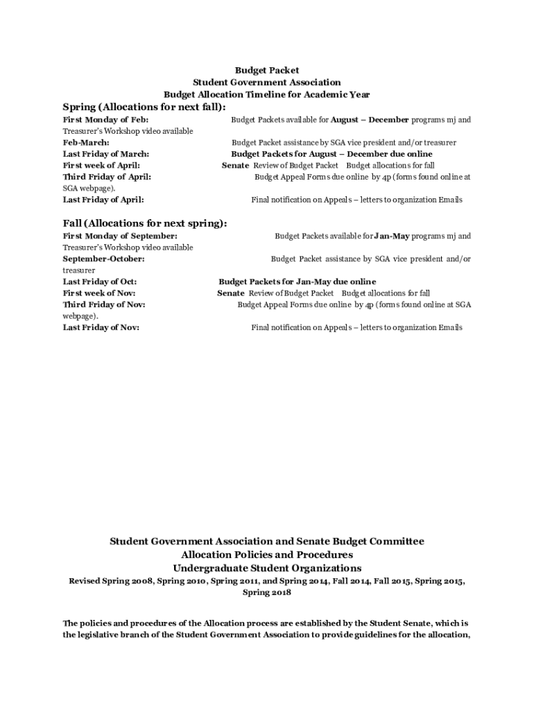 Budget Packet Student Government Association Budget Allocation Timeline for Academic Hairspring (Allocations for next fall): First Monday of Feb: Treasurers Workshop video available Feb March: Last