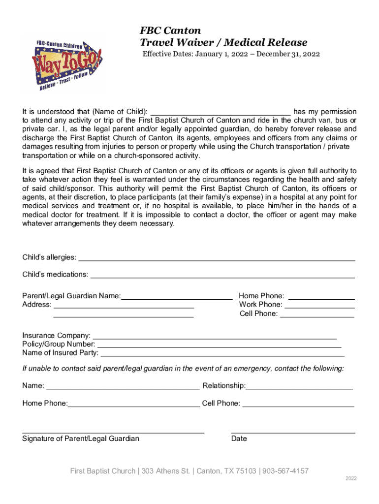 BBC Canton Travel Waiver / Medical Release Effective Dates: January 1, 2022, December 31, 2022It is understood that (Name of Child): ___ has my permission to attend any activity or trip of the First
