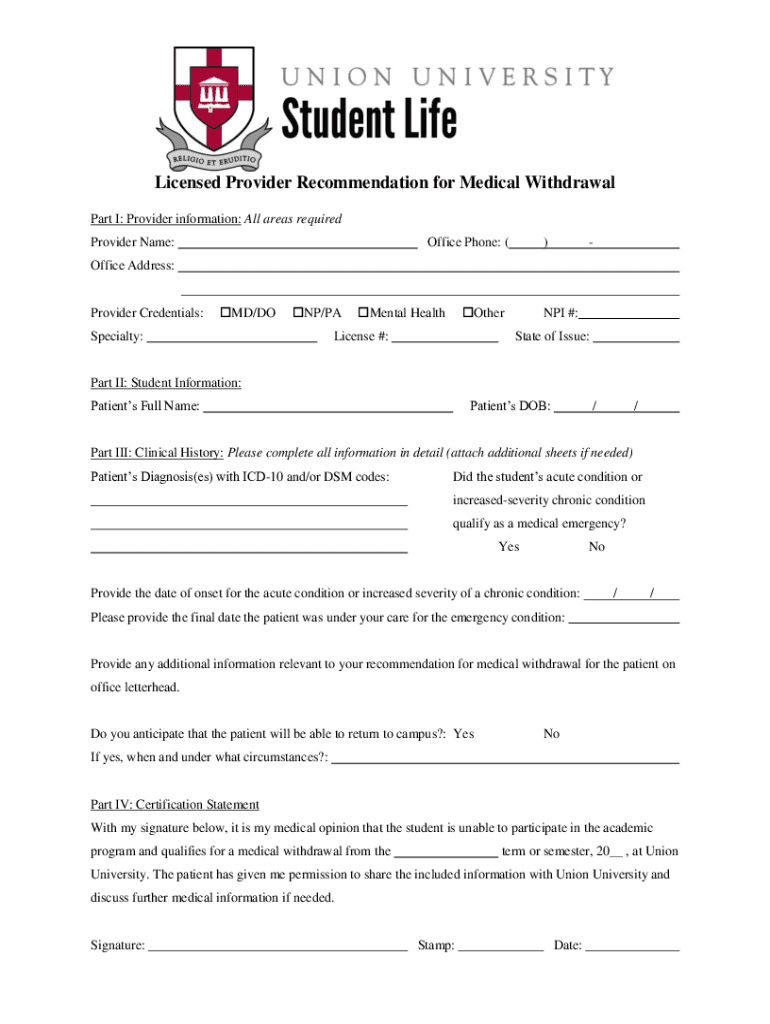 Get the free Licensed Provider Recommendation for Medical Withdrawal. Medical Withdrawal form