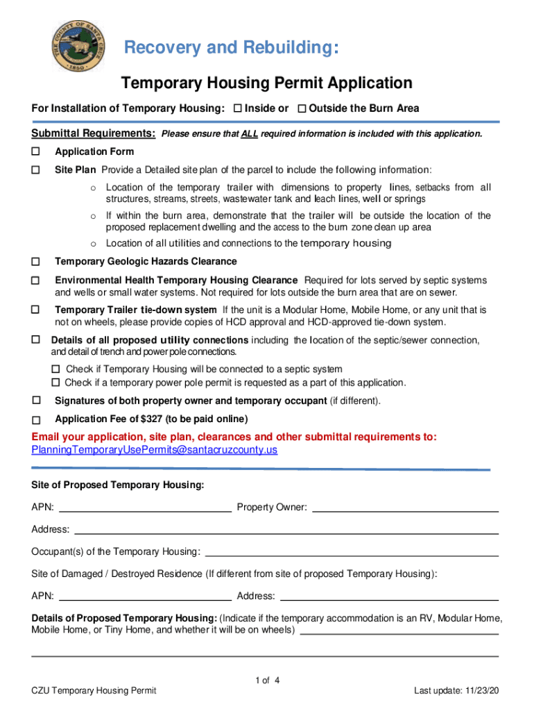 Recovery and Rebuilding: Temporary Housing Permit Application For Installation of Temporary Housing: Inside or Outside the Burn Area Submittal Requirements: Please ensure that ALL required information