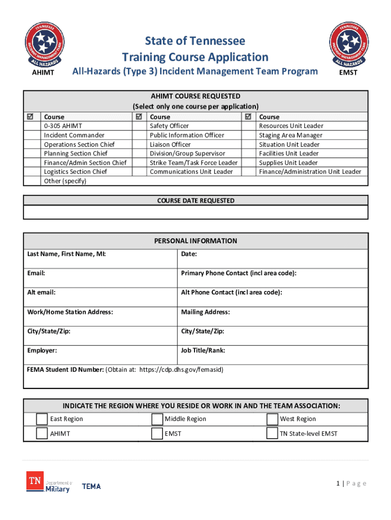 State of Tennessee Training Course ApplicationAllHazards (Type 3) Incident Management Team ProgramAHIMTCourse 0305 AH IMT Incident Commander Operations Section Chief Planning Section Chief Finance/Admin