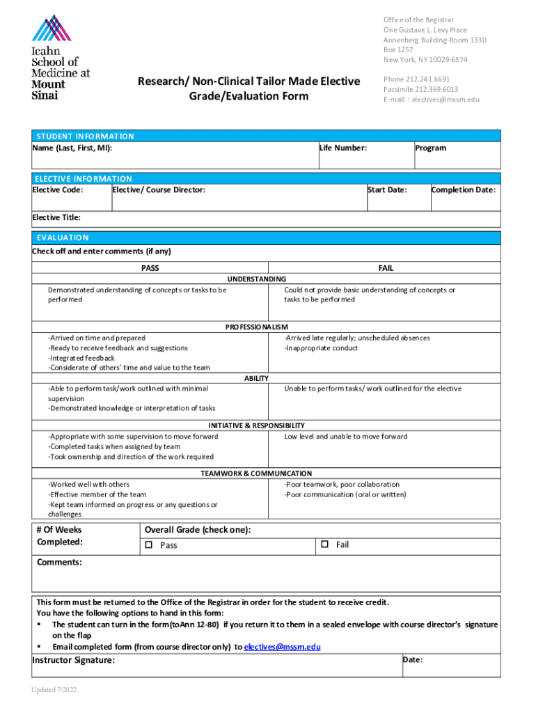 Office of the Registrar One Gustav L. Levy Place Vandenberg BuildingRoom 1330 Box 1257 New York, NY 100296574Research/ Nonclinical Tailor Made Elective Grade/Evaluation Form STUDENT IN FORM ACTION