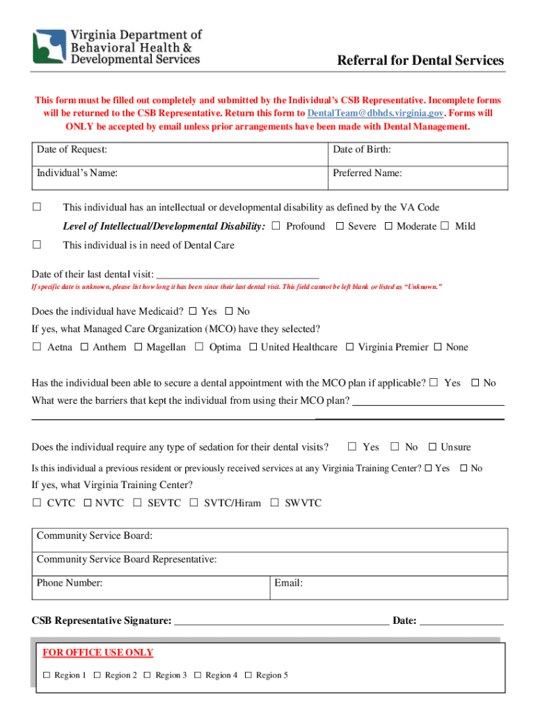 Referral for Dental Services This form must be filled out completely and submitted by the Individuals CSS Representative. Incomplete forms will be returned to the CSS Representative. Return this form