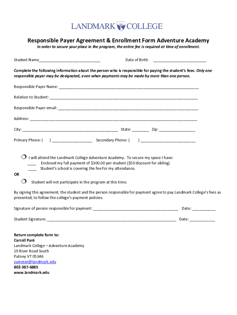Responsible Payer Agreement & Enrollment Form Adventure Academy In order to secure your place in the program, the entire fee is required at time of enrollment. Student Name___Date of Birth:___Complete