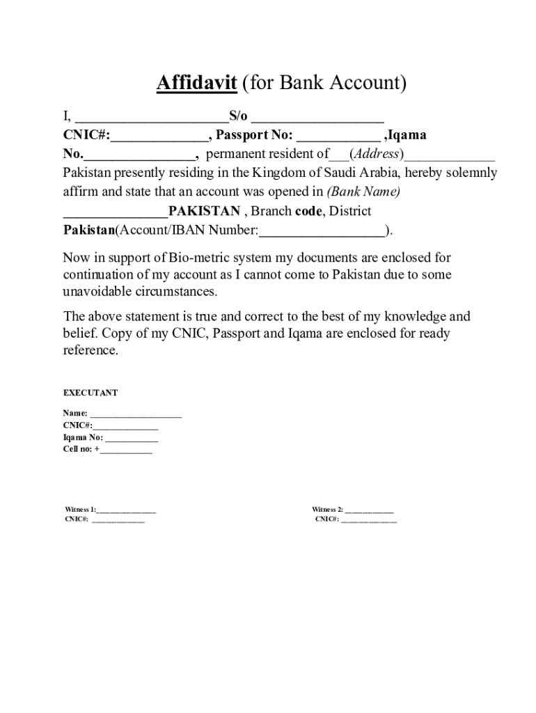 Affidavit (for Bank Account) I, ___S/o ___ CNIC#:___, Passport No: ___, Drama No.___, permanent resident of___(Address)___ Pakistan presently residing in the Kingdom of Saudi Arabia, hereby solemnly
