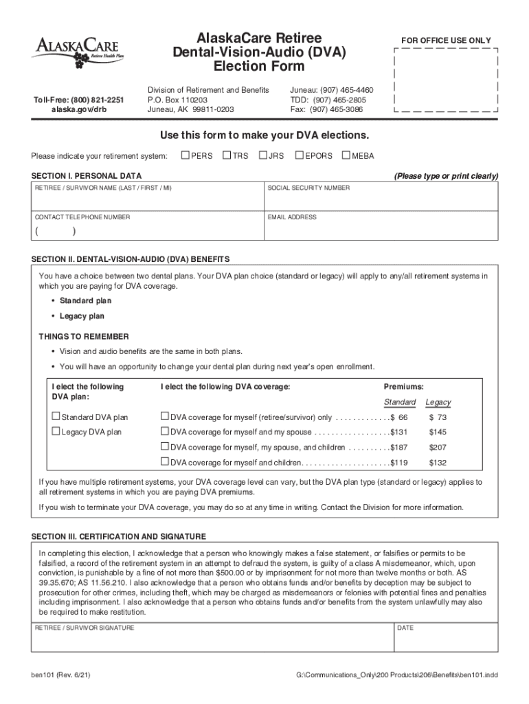 Alasdair Retiree DentalVisionAudio (DVA) Election Form Toll-free: (800) 8212251 alaska.gov/drbDivision of Retirement and Benefits P.O. Box 110203 Juneau, AK 998110203FOR OFFICE USE ONLY Juneau: (907)