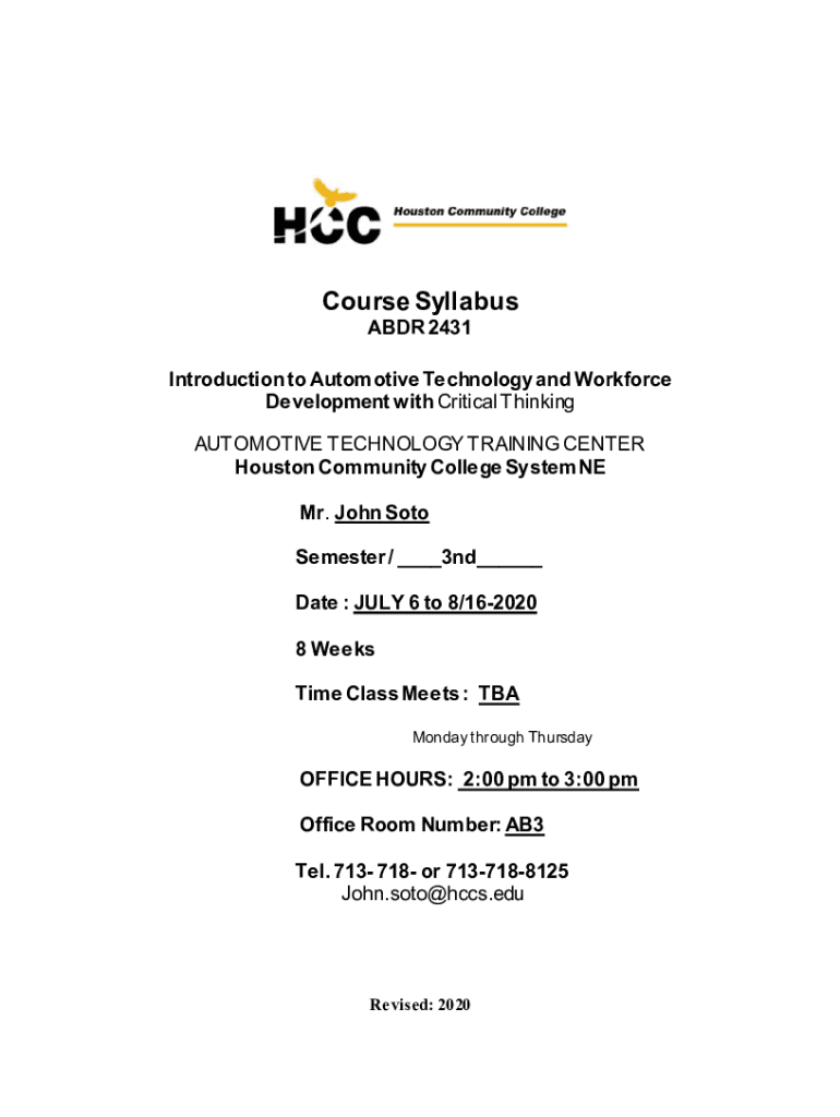 Course Syllabus ADR 2431Introduction to Automotive Technology and Workforce Development with Critical Thinking AUTOMOTIVE TECHNOLOGY TRAINING CENTER Houston Community College System NE Mr. John Soto