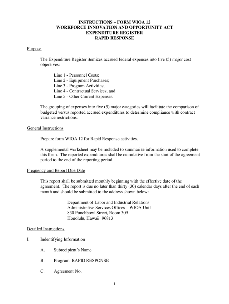 INSTRUCTIONS FORM WHOA 12 WORKFORCE INNOVATION AND OPPORTUNITY ACT EXPENDITURE REGISTER RAPID RESPONSE Purpose The Expenditure Register itemizes accrued federal expenses into five (5) major cost objectives: