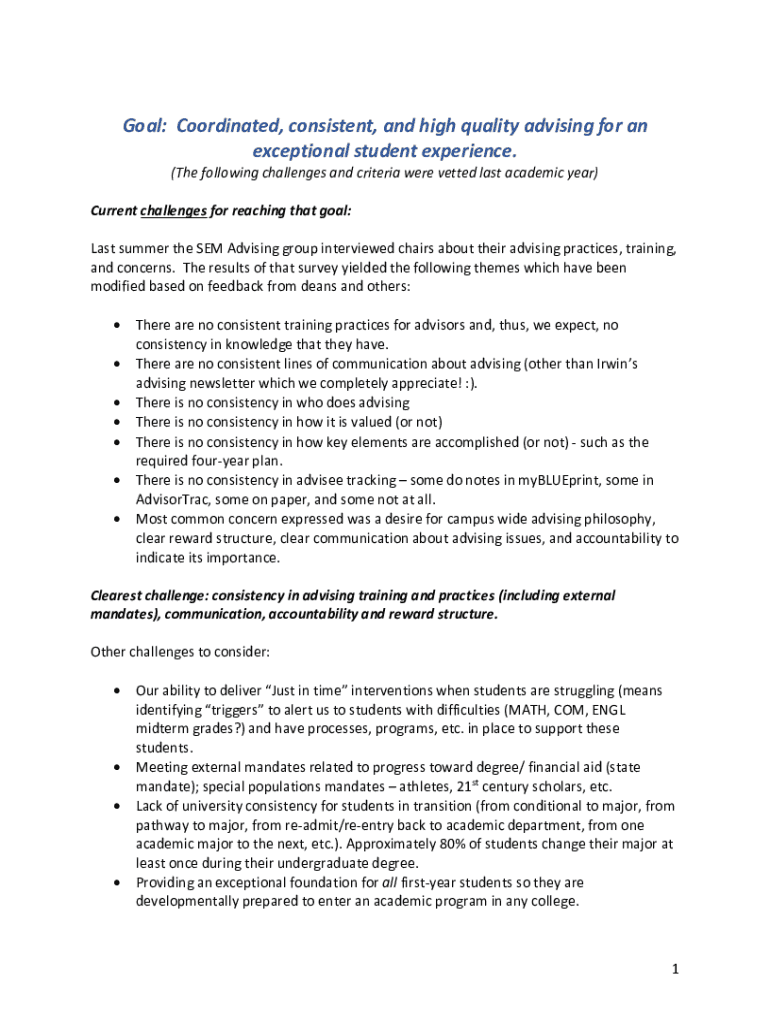 Goal: Coordinated, consistent, and high quality advising for an exceptional student experience. (The following challenges and criteria were vetted last academic year) Current challenges for reaching