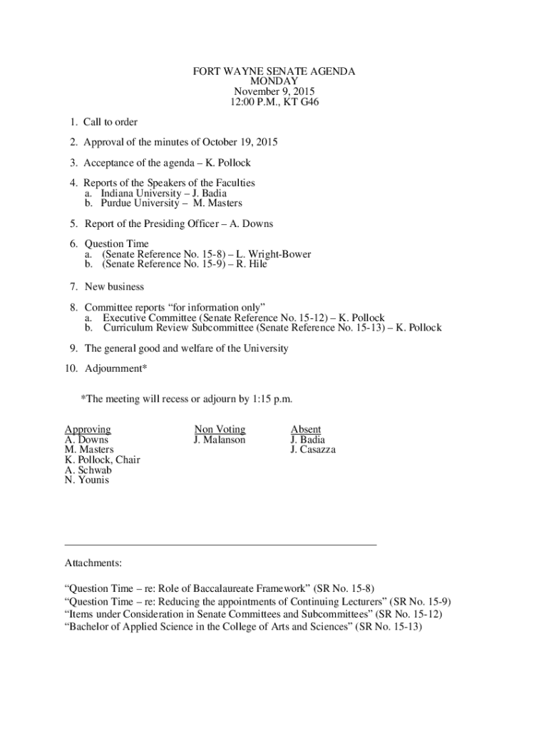 FORT WAYNE SENATE AGENDA MONDAY, November 9, 2015 12:00 P.M., KT G46 1. Call to order 2. Approval of the minutes of October 19, 2015 3. Acceptance of the agenda K. Pollock 4. Reports of the Speakers