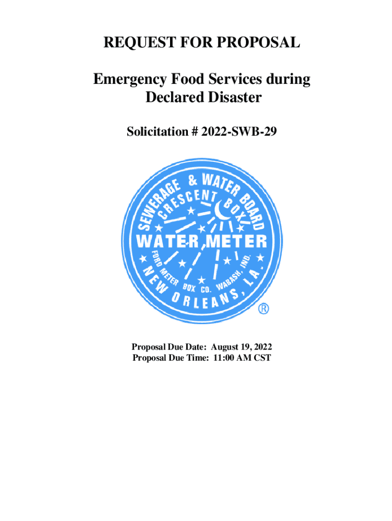 REQUEST FOR PROPOSAL Emergency Food Services during Declared Disaster Solicitation # 2022SWB29Proposal Due Date: August 19, 2022, Proposal Due Time: 11:00 AM Sewerage and Water Board of New Orleans
